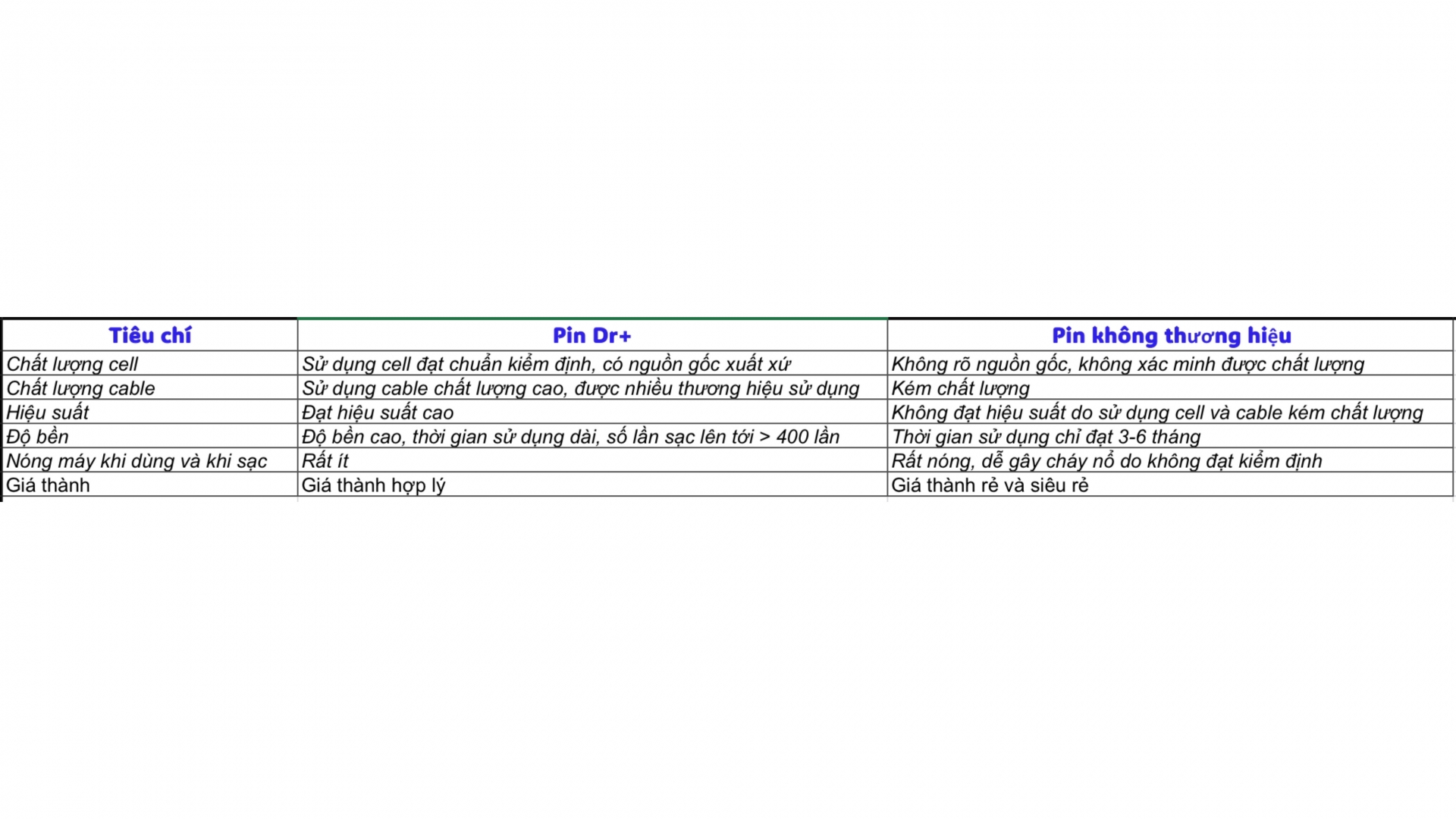 • Chu kỳ sạc thấp, chỉ vài tháng đã chai, trong khi pin chất lượng có thể dùng từ một đến hai năm